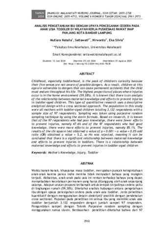 Mutiara, Natalia and Setiawati, Setiawati and Nirwanto, Nirwanto and Eka, Silvia (2024) Analisis pengetahuan ibu dengan upaya pencegahan cedera pada anak usia toddler di Wilayah Kerja Puskesmas Rawat Inap Panjang Kota Bandar Lampung. Manuju: Malahayati Nursing Journal, 6 (8): 1. pp. 2961-2973. ISSN 2655-2728