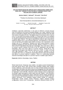 Waktu kanak-kanak, khususnya masa toddler, merupakan puncak keingintahuan anak-anak karena panca indra mereka tidak menyadari bahaya yang mungkin terjadi. Akibatnya, anak-anak pada usia ini rentan terhadap bahaya yang dapat menyebabkan kecelakaan permanen yang harus ditanggung oleh anak sepanjang usianya. Adapun urutan proporsi terbanyak untuk tempat terjadinya cedera yaitu di lingkungan rumah (59,38%). Diketahui analisis hubungan antara pengetahuan ibu dengan upaya pencegahan cedera pada anak usia toddler. Jenis penelitian kuantitatif dengan menggunakan desain deskriptif analitik dengan pendekatan cross sectional. Populasi pada penelitian ini semua ibu yang memiliki anak usia toddler berjumlah 3.132 responden dengan jumlah sampel 97 responden. Pengambilan sampel dengan Teknik Purposive random sampling dengan menggunakan rumus slovin. Berdasarkan penelitian diketahui bahwa dari 97 responden yang memiliki pengetahuan kurang baik, lebih sedikit upaya pencegahan cedera yaitu 47,6% dan responden memiliki pengetahuan baik , lebih banyak lebih banyak upaya pencegahan cedera yaitu 85,1 %. Hasil uji chi-square diperoleh nilai p = 0,001 > nilai a = 0,05 odd ratio (OR) diperoleh nilai = 5,2 artinya dapat disimpulkan bahwa ada hubungan antara Pengetahuan Ibu Dengan Upaya Pencegahan Cedera Pada Anak Usia Toddler. Ada hubungan antara pengetahuan ibu dengan upaya pencegahan cedera pada anak usia toddler di Wilayah Kerja Puskesmas Rawat Inap Panjang Kota Bandar Lampung