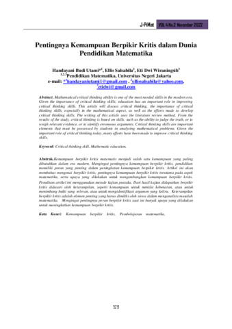 Handayani, Budi Utami and Ellis, Salsabila and Eti, Dwi Wiraningsih (2022) Pentingnya kemampuan berpikir kritis dalam dunia pendidikan matematika. Jurnal Pendidikan Matematika (J-PiMat), 4 (2): 8. pp. 529-538. ISSN 2684-7981