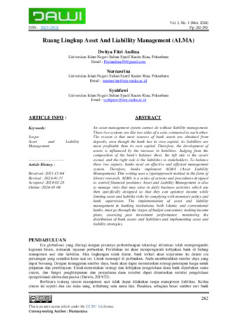 Dwitya, Fitri Andina and Nurnasrina, Nurnasrina and Syahfawi, Syahfawi (2024) Ruang lingkup Asset and Liabillity Management (ALMA). Journal of Ahkam Wa Iqtishad, 2 (1): 2. pp. 282-290. ISSN 3025-292X