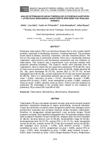 Nafila, Nafila and Lisa, Setia and Yustin, Ari Prihandini and Aulia, Ramadhani and Adies, Riyana (2024) Analisis determinan kejadian tuberkulosis di Puskesmas Martapura 1 (Studi kasus berdasarkan karakteristik responden dan penilaian biokimia). Manuju: Malahayati Nursing Journal, 6 (8): 2. pp. 2974-2973. ISSN 2655-2728