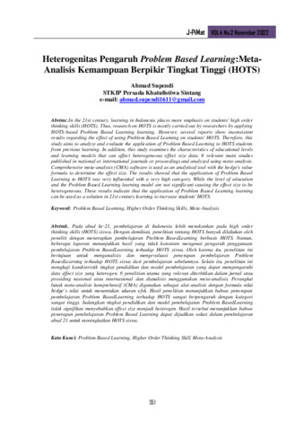 Pada abad ke-21, pembelajaran di Indonesia lebih menekankan pada high order thinking skills (HOTS) siswa. Dengan demikian, penelitian tentang HOTS banyak dilakukan oleh peneliti dengan menerapkan pembelajaran Problem BasedLearning berbasis HOTS. Namun, beberapa laporan menunjukkan hasil yang tidak konsisten mengenai pengaruh penggunaan pembelajaran Problem BasedLearning terhadap HOTS siswa. Oleh karena itu, penelitian ini bertujuan untuk menganalisis dan mengevaluasi penerapan pembelajaran Problem BasedLearning terhadap HOTS siswa dari pembelajaran sebelumnya. Selain itu, penelitian ini mengkaji karakteristik tingkat pendidikan dan model pembelajaran yang dapat mempengaruhi data effect size yang heterogen. 6 penelitian utama yang relevan diterbitkan dalam jurnal atau prosiding nasional atau internasional dan dianalisis menggunakan meta-analisis. Perangkat lunak meta-analisis komprehensif (CMA) digunakan sebagai alat analisis dengan formula nilai hedge’s nilai untuk menentukan ukuran efek. Hasil penelitian menunjukkan bahwa penerapan pembelajaran Problem BasedLearning terhadap HOTS sangat berpengaruh dengan kategori sangat tinggi. Sedangkan tingkat pendidikan dan model pembelajaran Problem Based Learning tidak signifikan menyebabkan effect size menjadi heterogen. Hasil tersebut menunjukkan bahwa penerapan pembelajaran Problem Based Learning dapat dijadikan solusi dalam pembelajaran abad 21 untuk meningkatkan HOTS siswa