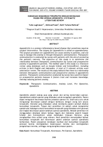 Yulia, Luginasari and Akhmad, Faozi and Delli, Yuliana Rahmat (2024) Hubungan komunikasi terapeutik dengan kecemasan pasien pre operasi apendisitis: Systematic literature review. Manuju: Malahayati Nursing Journal, 6 (8): 2. pp. 2988-3001. ISSN 2655-2728