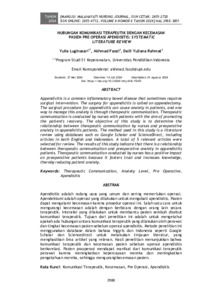 Apendisitis adalah radang usus yang umum dan sering memerlukan operasi. Apendektomi adalah operasi yang dilakukan untuk mengobati apendisitis. Pasien dapat mengalami kecemasan karena prosedur operasi ini. Salah satu cara untuk mengurangi kecemasan adalah dengan berbicara dengan orang lain secara terapeutik. Interaksi yang dilakukan untuk membantu pasien sembuh disebut komunikasi terapeutik. Tujuan dari penelitian ini adalah untuk mengetahui apakah ada hubungan antara komunikasi terapeutik yang dilakukan oleh perawat dan tingkat kecemasan pasien sebelum operasi apendisitis. Metode penelitian ini menggunakan database dalam bahasa Inggris dan Indonesia seperti Google Scholar dan Sciencedirect untuk melakukan tinjauan literatur, yang menghasilkan lima artikel yang relevan. Hasil penelitian menunjukkan bahwa komunikasi terapeutik dan kecemasan pasien sebelum operasi apendisitis berkorelasi. Pasien praoperasi mendapat manfaat dari komunikasi terapeutik perawat karena meningkatkan kepercayaan mereka dan meningkatkan pengetahuan mereka, sehingga mengurangikecemasan pasien.