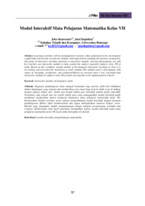 Kegiatan pembelajaran akan menjadi bermakna bagi peserta didik bila dilakukan dalam lingkungan yang nyaman dan memberikan rasa aman bagi peserta didik serta di dukung dengan adanya bahan ajar. Salah satu bentuk bahan ajar interaktif adalah modul interaktif. Fenomena yang terjadi saat ini, masih sedikit guru yang menggunakan modul interaktif untuk membantu menjelaskan materi pelajaran khususnya mata pelajaran matematika kelas VII. Berdasarkan kondisi tersebut, perlu adanya pengembangan modul interaktif dengan harapan pembelajaran dikelas tidak membosankan dan dapat meningkatkan motivasi belajar siswa. Metode yang digunakan adalah pengembangan dengan tahapan perancangan, produksi dan evaluasi. Berdasarkan data hasil penelitian disimpulkan bahwa modul interaktif pada mata pelajaran matematika kelas VII layak untuk diterapkan di sekolah.