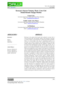 Marriage is the sunnah of the Apostle and worship for everyone who is ready and physically and mentally capable. The principle of marriage is to form a family or household that is sakinah mawaddah warahmah. There are several things that must be maintained together in a marriage, one of which is property. The continuity of life in a marriage requires property. Islam explains that the husband is obliged to meet the needs of the household but in today's modern life, the wife's role is not only to serve her husband and take care of children, but has also played a role in helping her family's economy and has an economic job. Whereas the obligation to earn a living is only imposed on the husband who is the backbone of the family. This article aims to examine how the Quran explains the position of jointly acquired property (gono gini) in the household, although the Quran explains it specifically. Basically, this paper is qualitative in nature because the working instrument is library research. All data is in the form of written library materials, including books/books, research reports, papers, scientific journals, inertenet data and others. This research explains that in the perspective of the Koran, there are no strict rules regarding joint property in the household. Scholars have different opinions about joint property. The first opinion says Islam does not recognize the existence of joint property except by shirkah. Meanwhile, another opinion states that the occurrence of marriage is considered a shirkah between the husband and wife. However, in Indonesian Islamic law, joint property is explained in Article 35 of the Marriage Law and Articles 85-97 of the Compilation of Islamic Law (KHI). Husband and wife have full rights to perform legal actions on each other's property, such as grants, charity, or others. However, a husband or wife is not allowed to sell or transfer joint property without the consent of one of the parties.