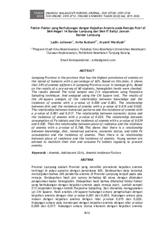 Ladin, Juliawan and Anita, Bustami and Aryanti, Wardiyah (2024) Faktor-faktor yang berhubungan dengan kejadian anemia pada remaja putri di SMA Negeri 14 Bandar Lampung dan SMA IT Baitul Jannah Bandar Lampung. Manuju: Malahayati Nursing Journal, 6 (8): 5. pp. 3015-3026. ISSN 2655-2728