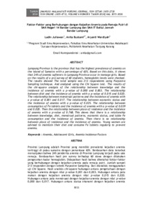 Provinsi Lampung adalah Provinsi yang memiliki prevalensi kejadian anemia tertinggi di pulau sumatra dengan persentase 63%. Berdasarkan data tersebut menunjukan bahwa 24% penderita anemia di Provinsi Lampung terjadi pada usia remaja. Berdasarkan hasil pre survey terhadap 60 siswa dengan dilakukan pengecekan kadar hemoglobin. Didapatkan hasil bahwa diketahui faktor-faktor yang berhubungan dengan kejadian anemia pada remaja putri. Jumlah sampel 213 responden dengan teknik Purposive Sampling. Dan dianalisis menggunakan uji Chi Square. Hasil analisis chi-square hubungan antara pengetahuan dengan kejadian anemia dengan nilai p-value 0,001 dan 0,003. Hubungan antara pola makan dengan kejadian anemia dengan nilai p-value 0,015 dan 0,020. Hubungan antara pola menstruasi dengan kejadian anemia dengan nilai p-value 0,000 dan 0,017. Hubungan antara status ekonomi dengan kejadian anemia dengan nilai p-value 0,025. Hubungan antara kosumsi tablet Fe dengan kejadian anemia dengan nilai p-value 0,039 dan 0,020. Kemudian hubungan antara tempat tinggal dengan kejadian anemia dengan niali p-value 0,768. Hal ini menunjukan bahwa ada hubungan antara pengetahuan, pola makan, pola menstruasi, status ekonomi, dan kosumsi table Fe dengan kejadian anemia. Kemudian tidak ada hubungan antara tempat tinggal dengan kejadian anemia. Remaja putri disarankan untuk menjaga pola makan dan mengkosumsi tablet Fe secara teratur untuk mencegah terjadinya anemia.