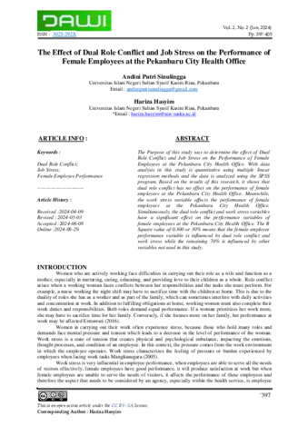Andini, Putri Sinulingga and Hariza, Hasyim (2024) The effect of dual role conflict and job stress on the performance of female employees at the Pekanbaru City Health Office. Journal of Ahkam Wa Iqtishad, 2 (2): 6. pp. 397-405. ISSN 3025-292X