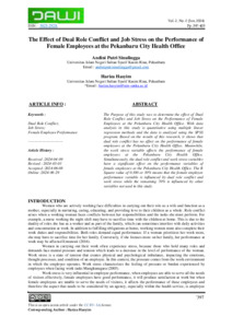 The Purpose of this study was to determine the effect of Dual Role Conflict and Job Stress on the Performance of Female Employees at the Pekanbaru City Health Office. With data analysis in this study is quantitative using multiple linear regression methods and the data is analyzed using the SPSS program. Based on the results of this research, it shows that dual role conflict has no effect on the performance of female employees at the Pekanbaru City Health Office. Meanwhile, the work stress variable affects the performance of female employees at the Pekanbaru City Health Office. Simultaneously, the dual role conflict and work stress variables have a significant effect on the performance variables of female employees at the Pekanbaru City Health Office. The R Square value of 0.300 or 30% means that the female employee performance variable is influenced by dual role conflict and work stress while the remaining 70% is influenced by other variables not used in this study.