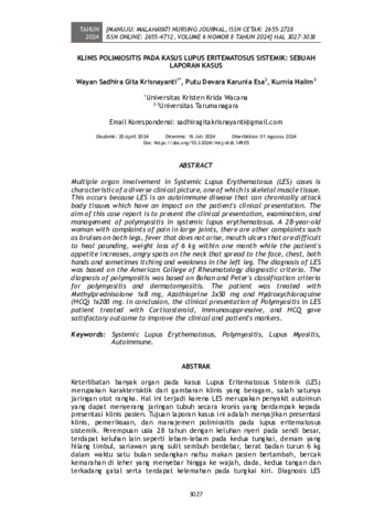 Wayan, Sadhira Gita Krisnayanti and Putu, Devara Karunia Esa and Kurnia, Halim (2024) Klinis polimiositis pada kasus lupus eritematosus sistemik: Sebuah laporan kasus. Manuju: Malahayati Nursing Journal, 6 (8): 6. pp. 3027-3038. ISSN 2655-2728