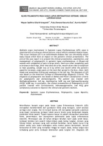Keterlibatan banyak organ pada kasus Lupus Eritematosus Sistemik (LES) merupakan karakterisktik dari gambaran klinis yang beragam, salah satunya jaringan otot rangka. Hal ini terjadi karena LES merupakan penyakit autoimun yang dapat menyerang jaringan tubuh secara kronis yang berdampak kepada presentasi klinis pasien. Tujuan laporan kasus ini adalah menyajikan presentasi klinis, pemeriksaan, dan manajemen polimiositis pada lupus eritematosus sistemik. Perempuan usia 28 tahun dengan keluhan nyeri pada sendi besar, terdapat keluhan lain seperti lebam-lebam pada kedua tungkai, demam yang hilang timbul, sariawan yang sulit sembuh berdebar, berat badan turun 6 kg dalam waktu satu bulan sedangkan nafsu makan pasien bertambah, bercak kemarahan di leher yang menyebar hingga ke wajah, dada, kedua tangan dan terkadang gatal serta terdapat kelemahan pada tungkai kiri. Diagnosis LES didapatkan berdasarkan kriteria diagnostik American College of Rheumatology. Diagnosis polimiositis berdasarkan kriteria klasifikasi Bohan dan Peter untuk polimiositis dan dermatomiositis. Pasien diterapi dengan Methylprednisolone 1x8 mg, Azathioprine 3x50 mg dan Hydroxychloroquine (HCQ) 1x200 mg. Kesimpulan dari presentasi klinis pasien Polimiositis pada LES yang diterapi dengan Kortikosteroid, Imunosupresif, dan HCQ memberikan luaran yang memuaskan untuk memperbaiki klinis dan petanda pasien.
