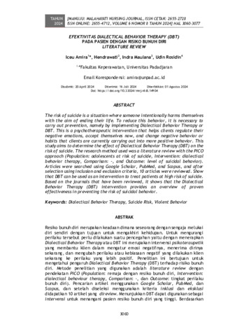 Iceu, Amira and Hendrawati, Hendrawati and Indra, Maulana and Udin, Rosidin (2024) Efektivitas Dialectical Behavior Therapy (DBT) pada pasien dengan risiko bunuh diri: Literature review. Manuju: Malahayati Nursing Journal, 6 (8): 9. pp. 3060-3077. ISSN 2655-2728
