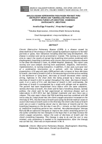Amellia, Ellga Frissanthy and Vivop, engga (2024) Analisa asuhan keperawatan pada pasien penyakit paru obstruktif kronis dan tuberkulosis paru dengan intervensi pursed lips breathing kombinasi diafragmatic breathing. Manuju: Malahayati Nursing Journal, 6 (8): 17. pp. 3165-3176. ISSN 2655-2728