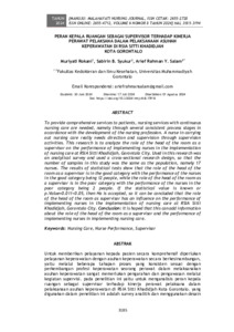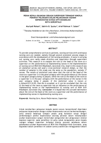 Muriyati, Rokani and Sabirin, B. Syukur and Arief, Rahman Y. Salam (2024) Peran kepala ruangan sebagai supervisor terhadap kinerja perawat pelaksana dalam pelaksanaan asuhan keperawatan di RSIA Sitti Khadidjah Kota Gorontalo. Manuju: Malahayati Nursing Journal, 6 (8): 19. pp. 3185-3194. ISSN 2655-2728