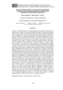 Ansietas adalah suatu perasaan takut akan terjadinya sesuatu yang disebabkan oleh antisipasi bahaya dan merupakan sinyal yang membantu individu untuk bersiap mengambil tindakan menghadapi ancaman. observasi terhadap 10 mahasiswa Program Studi Ilmu Keperawatan yang sedang menyusun skripsi di Universitas Malahayati Bandar Lampung pada tanggal 13 Maret 2023, dengan melakukan wawancara dan observasi terdapat 7 mahasiswa Fakultas Ilmu Kesehatan yang sedang menyusun skripsi dan diperoleh informasi bahwa semua mahasiswa mengatakan merasakan kecemasan dalam mengerjakan skripsi, kesulitan yang paling utama adalah mencari referensi yang relevan, takut bertemu dengan dosen pembimbing, dosen pembimbing skripsi susah ditemui, apabila dalam mengerjakan skripsi dengan keadaan berisik membuat subyek tidak bisa berkonsentrasi, merasa gelisah, selera makan berkurang, mengeluh sering pusing, cemas, stress, malas dan sulit tidur karena terlalu memikirkan skripsi. Terdapat 3 mahasiswa tidak merasa cemas, optimis untuk menyelesaikan skripsi tepat waktu. Diketahui pengaruh terapi hipnotis lima jari untuk menurunkan kecemasan pada mahasiswa yang sedang menyusun skripsi di Universitas Malahayati Tahun 2022. Jenis penelitian kuantitatif, Rancangan dalam penelitian ini menggunakan desain pre eksperimen dengan pendekatan one group pretes-postes. Sampel dalam penelitian ini adalah mahasiswi S1 Keperawatan Universitas Malahayati sejumlah 31 orang. Teknik sampling dalam penelitian ini adalah total sampling. Analisa pada uji univariate dan bivariate menggunakan uji t-tes dependen. Didapatkan hasil bahwa nilai rata-rata kecemasan pada mahasiswa yang sedang menyusun skripsi sebelum diberi terapi hipnotis lima jari yaitu 23.1 dan nilai rata-rata kecemasan setelah diberi terapi hipnotis lima jari yaitu 11.3. Dari hasil uji statistik didapatkan nilai r = 0,000 (p hitung < α), artinya pada a = 5% dapat diartikan ada pengaruh terapi hipnotis lima jari untuk menurunkan kecemasan pada mahasiswa yang sedang menyusun skripsi di Universitas Malahayati Tahun 2023. Terdapat pengaruh dari terapi hipnotis lima jari untuk menurunkan kecemasan pada mahasiswa yang sedang menyusun skripsi di Universitas Malahayati Tahun 2023. Diharapkan kepada mahasiswa yang sedang menyusun skripsi untuk aktif dalam menjalankan terapi hipnotis lima jari dalam menangani masalah kecemasan (ansietas) secara mandiri dengan keadaan rileks demi menjaga kesehatan.