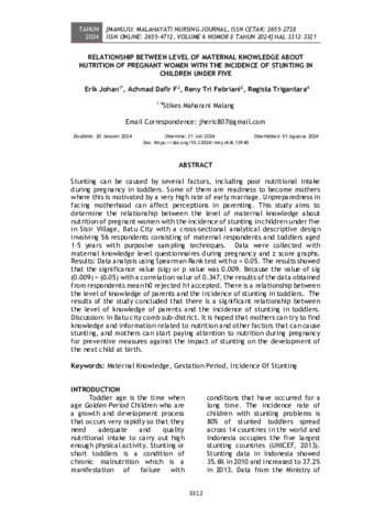 Erik, Johan and Achmad, Dafir F and Reny, Tri Febriani and Regista, Trigantara (2024) Relationship between level of maternal knowledge about nutrition of pregnant women with the incidence of stunting in children under five. Manuju: Malahayati Nursing Journal, 6 (8): 30. pp. 3312-3321. ISSN 2655-2728