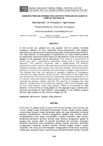Reza, Reynaldi and M., Ali Maulana and Yoga, Pramana (2024) Gambaran perilaku berisiko pada aktivitas penggunaan gadget di agregat usia remaja. Manuju: Malahayati Nursing Journal, 6 (8): 32. pp. 3388-3404. ISSN 2655-2728