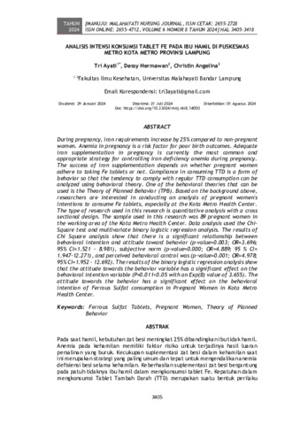 Tri, Ayati and Dessy, Hermawan and Christin, Angelina (2024) Analisis intensi konsumsi tablet Fe pada ibu hamil di Puskesmas Metro Kota Metro Provinsi Lampung. Manuju: Malahayati Nursing Journal, 6 (8): 33. pp. 3405-3418. ISSN 2655-2728