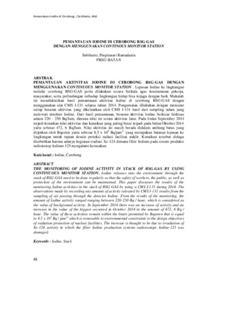 Subiharto, Subiharto and Puspitasari Ramadania, PR (2015) PEMANTAUAN IODINE DI CEROBONG RSG-GAS DENGAN MENGGUNAKAN CONTINOUS MONITOR STATION. Buletin "Reaktor". ISSN ISSN: 0216-2695