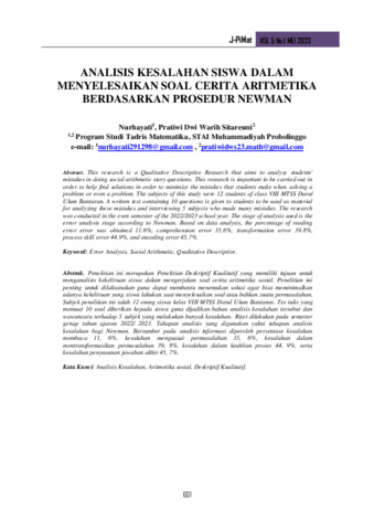 Penelitian ini merupakan Penelitian Deskriptif Kualitatif yang memiliki tujuan untuk menganalisis kekeliruan siswa dalam mengerjakan soal cerita aritmetika sosial. Penelitian ini penting untuk dilaksanakan guna dapat membantu menemukan solusi agar bisa meminimalkan adanya kekeliruan yang siswa lakukan saat menyelesaikan soal atau bahkan suatu permasalahan. Subjek penelitian ini ialah 12 orang siswa kelas VIII MTSS Darul Ulum Bantaran. Tes tulis yang memuat 10 soal diberikan kepada siswa guna dijadikan bahan analisis kesalahan tersebut dan wawancara terhadap 5 subjek yang melakukan banyak kesalahan. Riset dilakukan pada semester genap tahun ajaran 2022/ 2023. Tahapan analisis yang digunakan yakni tahapan analisis kesalahan bagi Newman. Bersumber pada analisis informasi diperoleh persentase kesalahan membaca 11, 6%, kesalahan menguasai permasalahan 35, 6%, kesalahan dalam mentransformasikan permasalahan 39, 8%, kesalahan dalam keahlian proses 44, 9%, serta kesalahan penyusunan jawaban akhir 45, 7%.