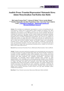 Translasi dalam konteks representasi matematis merupakan proses penerjemahan dari satu bentuk representasi ke bentuk representasi lain tanpa mengubah makna dari objek yang direpresentasikan. Penelitian ini merupakan penelitian pendahuluan yang bertujuan untuk melihat bagaimana proses translasi representasi matematis siswa kelas VIII pada topik kubus dan balok. Metode kualitatif digunakan dalam penelitian ini untuk memberikan deskripsi mendalam mengenai proses translasi representasi matematis siswa. Penelitian ini dilakukan terhadap siswa kelas VIII pada salah satu sekolah SMP di Kota Bekasi. Data diperoleh dari hasil tes berupa soal yang memuat topik kubus dan balok serta wawancara secara think aloud. Hasil penelitian menunjukkan bahwa dalam menyelesaikan soal kubus dan balok siswa melalui 4 tahapan dalam proses translasi representasi matematis yaitu unpacking the source, preliminary coordination, constructing the target, dan determining equivalence. Dari hasil penelitian ini, ditemukan bahwa selain melalui 4 tahapan proses translasi representasi matematis tersebut ternyata siswa juga dapat melakukan refleksi terhadap hasil jawabannya.