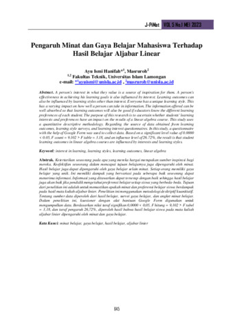 | Uncontrolled Keywords: | Minat belajar, Gaya belajar, Hasil belajar, Aljabar linier, Psikologi pendidikan, Metode pengajaran, Strategi belajar |