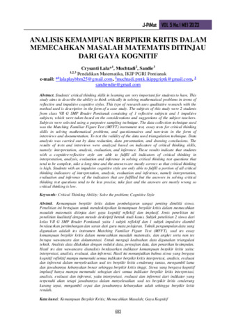 Crysanti, Lala and Muchtadi, Muchtadi and Sandie, Sandie (2023) Analisis kemampuan berpikir kritis dalam memecahkan masalah matematis ditinjau dari gaya kognitif. Jurnal Pendidikan Matematika (J-PiMat), 5 (1): 9. pp. 683-694. ISSN 2684-7981
