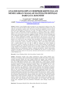Kemampuan berpikir kritis siswa dalam pembelajaran sangat penting dimiliki siswa. Penelitian ini bertujuan untuk mendeskripsikan kemampuan berpikir kritis dalam memecahkan masalah matematis ditinjau dari gaya kognitif reflektif dan implusif. Jenis penelitian ini menggunakan penelitian kualitatif dengan metode yang digunakan adalah deskriptif dengan bentuk studi kasus. Subjek penelitian ini yaitu 2 siswa dari kelas VII G SMP Bruder Pontianak yang terdiri dari 1 subjek reflektif dan 1 subjek impulsif, dimana diambil berdasarkan pertimbangan dan saran dari guru mata pelajaran. Subjek dipilih dengan menggunakan teknik purposive sampling. Teknik pengumpulan data yang digunakan adalah tes instrumen Matching Familiar Figure Test (MFFT), soal tes essay kemampuan berpikir kritis dalam memecahkan masalah matematis, dan angket serta non tes berupa wawancara dan dokumentasi. Untuk menguji keabsahan data digunakan triangulasi teknik. Analisis data dilakukan dengan reduksi data, penyajian data, dan penarikan kesimpulan. Hasil tes dan wawancara dianalisis berdasarkan indikator kemampuan berpikir kritis yaitu: interpretasi, analisis, evaluasi, dan inferensi. Hasil ini menunjukkan bahwa siswa yang bergaya kognitif reflektif mampu memenuhi semua indikator berpikir kritis interpretasi, analisis, evaluasi dan inferensi dalam menyelesaikan soal tes berpikir kritis cenderung tuntas, mengambil lama dan jawabannya kebanyakan benar sehingga berpikir kritis tinggi. Siswa yang bergaya kognitif implusif hanya mampu memenuhi sebagian dari semua indikator berpikir kritis interpretasi, analisis, evaluasi dan inferensi, yaitu interpretasi, evaluasi dan inferensi dari indikator yang terpenuhi akan tetapi jawabannya dalam menyelesaikan soal tes berpikir kritis cenderung kurang tepat, mengambil cepat dan jawabannya kebanyakan salah sehingga berpikir kritis rendah.