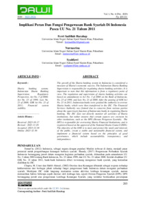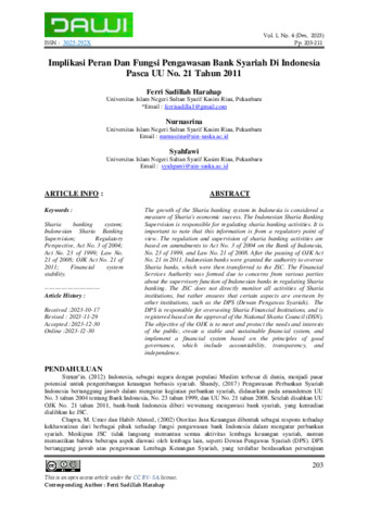 Ferri, Harahap and Nurnasrina, Nurnasrina and Syahfawi, Syahfawi (2023) Implikasi peran dan fungsi pengawasan Bank Syariah di Indonesia pasca UU No. 21 Tahun 2011. Journal of Ahkam Wa Iqtishad (JAWI), 1 (4): 6. pp. 203-211. ISSN 3025-292X