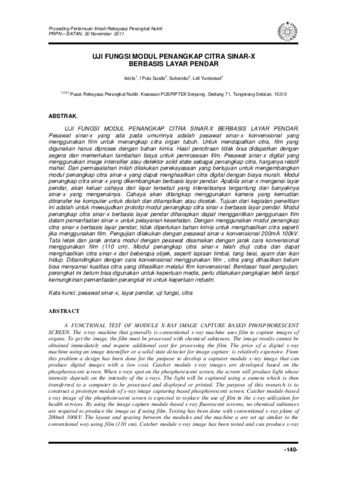 UJI FUNGSI MODUL PENANGKAP CITRA SINAR-X BERBASIS LAYAR PENDAR. Pesawat sinar-x yang ada pada umumnya adalah pesawat sinar-x konvensional yang menggunakan film untuk menangkap citra organ tubuh. Untuk mendapatkan citra, film yang digunakan harus diproses dengan bahan kimia. Hasil pencitraan tidak bisa didapatkan dengan segera dan memerlukan tambahan biaya untuk pemrosesan film. Pesawat sinar-x digital yang menggunakan image intensifier atau detektor solid state sebagai penangkap citra, harganya relatif mahal. Dari permasalahan inilah dilakukan perekayasaan yang bertujuan untuk mengembangkan modul penangkap citra sinar-x yang dapat menghasilkan citra digital dengan biaya murah. Modul penangkap citra sinar-x yang dikembangkan berbasis layar pendar. Apabila sinar-x mengenai layar pendar, akan keluar cahaya dari layar tersebut yang intensitasnya tergantung dari banyaknya sinar-x yang mengenainya. Cahaya akan ditangkap menggunakan kamera yang kemudian ditransfer ke komputer untuk diolah dan ditampilkan atau dicetak. Tujuan dari kegiatan penelitian ini adalah untuk mewujudkan prototip modul penangkap citra sinar-x berbasis layar pendar. Modul penangkap citra sinar-x berbasis layar pendar diharapkan dapat menggantikan penggunaan film dalam pemanfaatan sinar-x untuk pelayanan kesehatan. Dengan menggunakan modul penangkap citra sinar-x berbasis layar pendar, tidak diperlukan bahan kimia untuk menghasilkan citra seperti jika menggunakan film. Pengujian dilakukan dengan pesawat sinar-x konvensional 200mA 100kV. Tata letak dan jarak antara modul dengan pesawat disamakan dengan jarak cara konvensional menggunakan film (110 cm). Modul penangkap citra sinar-x telah diuji coba dan dapat menghasilkan citra sinar-x dari beberapa objek, seperti lapisan timbal, tang besi, ayam dan ikan hidup. Dibandingkan dengan cara konvensional menggunakan film , citra yang dihasilkan belum bisa menyamai kualitas citra yang dihasilkan melalui film konvensional. Berdasar hasil pengujian, perangkat ini belum bisa digunakan untuk keperluan medis, perlu dilakukan pengkajian lebih lanjut kemungkinan pemanfaatan perangkat ini untuk keperluan industri.