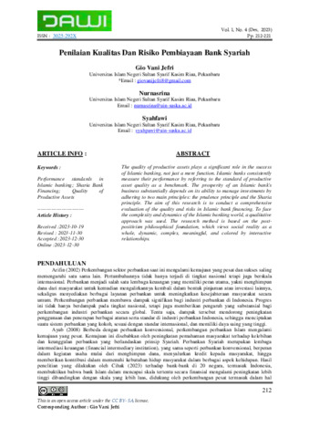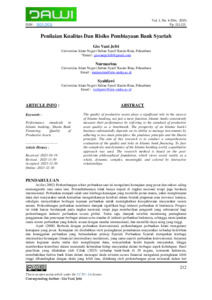 Gio, Vani Jefri and Nurnasrina, Nurnasrina and Syahfawi, Syahfawi (2023) Penilaian kualitas dan risiko pembiayaan bank syari'ah. Journal of Ahkam Wa Iqtishad (JAWI), 1 (4): 7. pp. 212-221. ISSN 3025-292X