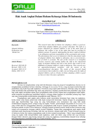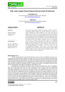 Alzekrillah, Syaf and Akbarizan, Akbarizan (2023) Hak anak angkat dalam hukum keluarga islam di Indonesia. Journal of Ahkam Wa Iqtishad (JAWI), 1 (4): 9. pp. 229-238. ISSN 3025-292X