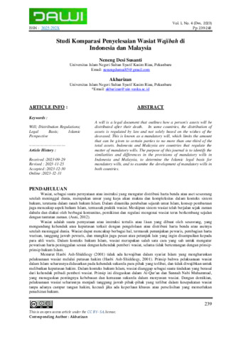 Neneng, Desi Susanti and Akbarizan, Akbarizan (2023) Studi komparasi penyelesaian wasiat wajibah di Indonesia dan Malaysia. Journal of Ahkam Wa Iqtishad (JAWI), 1 (4): 10. pp. 239-248. ISSN 3025-292X