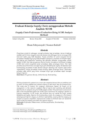 Ilham, Febryansyah and Nasrun, Baldah (2022) Evaluasi kinerja supply chain menggunakan metode analisis SCOR. Jurnal Ekonomi Manajemen Bisnis (EKOMABIS), 3 (1): 2. pp. 11-20. ISSN 2716-0238