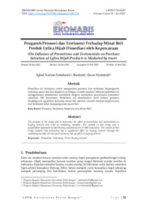 | Uncontrolled Keywords: | Promosi, Testimoni, Kepercayaan, Minat Beli, Sales promotion, Consumer behavior, Customer loyalty, Purchasing power |