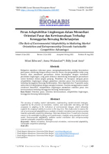 Ketepatan membaca informasi pasar, mengimplementasikan strategi berorientasi pada pasar, didukung dengan adanya inovasi, kreasi, dan pengambilan risiko yang terukur akan membantu perusahaan dalam beradaptasi dengan turbulensi perubahan lingkungan, yang pada akhirnya mendukung kemampuan perusahaan untuk bertahan dalam jangka panjang. Penelitian ini berupaya menguji peran adaptabilitas lingkungan sebagai pemediasi orientasi pasar dan kewirausahaan terhadap keunggulan bersaing berkelanjutan. Data diperoleh dari 71 pemilik usaha mikro kecil di marketplace dengan mengisi kuisioner. Analisis menggunakan model struktural SmartPLS. Adaptabilitas lingkungan memediasi orientasi pasar dan kewirausahaan terhadap keunggulan bersaing berkelanjutan.