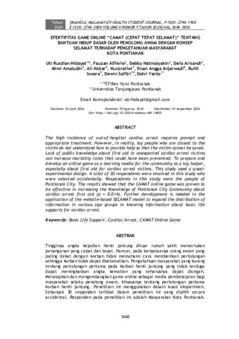 Uti, Rusdian Hidayat and Fauzan, Alfikrie and Debby, Hatmalyakin and Defa, Arisandi and Mimi, Amaludin and Ali, Akbar and Nurpratiwi, Nurpratiwi and Ihsan, Angga Anjarwadi and Ruhil, Iswara and Dewin, Safitri and Delvi, Yanto (2024) Efektifitas game online “CAMAT (Cepat Tepat Selamat)” tentang bantuan hidup dasar oleh penolong awam dengan konsep selamat terhadap pengetahuan masyarakat Kota Pontianak. MAHESA: Malahayati Health Student Journal, 4 (9): 4. pp. 3648-3658. ISSN 2746-198X