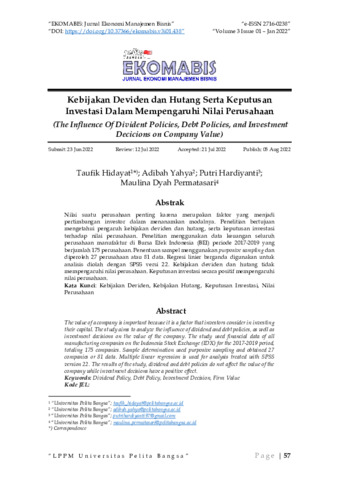 Taufik, Hidayat and Adibah, Yahya and Putri, Hardiyanti and Maulina, Dyah Permatasari (2022) Kebijakan deviden dan hutang serta keputusan investasi dalam mempengaruhi nilai perusahaan. Jurnal Ekonomi Manajemen Bisnis (EKOMABIS), 3 (1): 6. pp. 57-68. ISSN 2716-0238