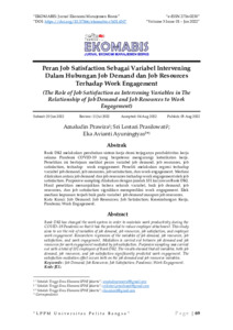Amaludin, Prawira and Sri, Lestari Prasilowati and Eka, Avianti Ayuningtyas (2022) Peran job satisfaction sebagai variabel intervening dalam hubungan job demand dan job resources terhadap work engagement. Jurnal Ekonomi Manajemen Bisnis (EKOMABIS), 3 (1): 7. pp. 69-82. ISSN 2716-0238