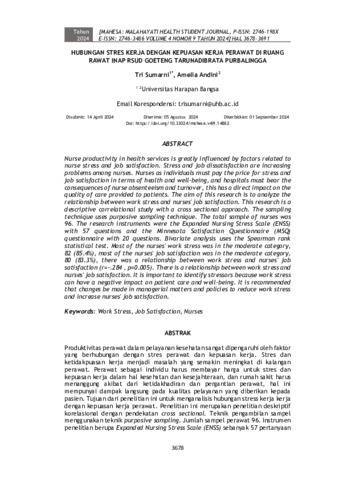 Tri, Sumarni and Amelia, Andini (2024) Hubungan stres kerja dengan kepuasan kerja perawat di ruang rawat inap RSUD Goeteng Tarunadibrata Purbalingga. MAHESA: Malahayati Health Student Journal, 4 (9): 6. pp. 3678-3691. ISSN 2746-198X