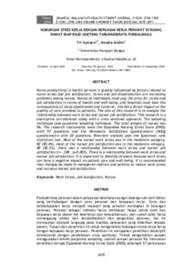 Produktivitas perawat dalam pelayanan kesehatan sangat dipengaruhi oleh faktor yang berhubungan dengan stres perawat dan kepuasan kerja. Stres dan ketidakpuasan kerja menjadi masalah yang semakin meningkat di kalangan perawat. Perawat sebagai individu harus membayar harga untuk stres dan kepuasan kerja dalam hal kesehatan dan kesejahteraan, dan rumah sakit harus menanggung akibat dari ketidakhadiran dan pergantian perawat, hal ini mempunyai dampak langsung pada kualitas pelayanan yang diberikan kepada pasien. Tujuan dari penelitian ini untuk menganalisis hubungan stress kerja kerja dengan kepuasan kerja perawat. Penelitian ini merupakan penelitian deskriptif korelasional dengan pendekatan cross sectional. Teknik pengambilan sampel menggunakan teknik purposive sampling. Jumlah sampel perawat 96. Instrumen penelitian berupa Expanded Nursing Stress Scale (ENSS) sebanyak 57 pertanyaan dan kuesioner Minnesota Satisfaction Questionnaire (MSQ) dengan 20 pertanyaan. Analisis bivariat menggunakan uji statistik spearman rank. Stres kerja perawat sebagian besar pada kategori cukup sebanyak 82 (85,4%), kepuasan kerja perawat sebagian besar pada kategori sedang sebanyak 80 (83,3%), ada hubungan stres kerja dengan kepuasan kerja perawat (r=-,284, p=0,005). Terdapat hubungan antara stres kerja dengan kepuasan kerja perawat. Penting untuk mengidentifikasi faktor penyebab stres karena stres kerja dapat menimbulkan dampak negatif pada perawatan dan kesejahteraan pasien. Disarankan agar dilakukan perubahan dalam urusan manajerial dan kebijakan untuk menurunkan stres kerja dan meningkatkan kepuasan kerja perawat.