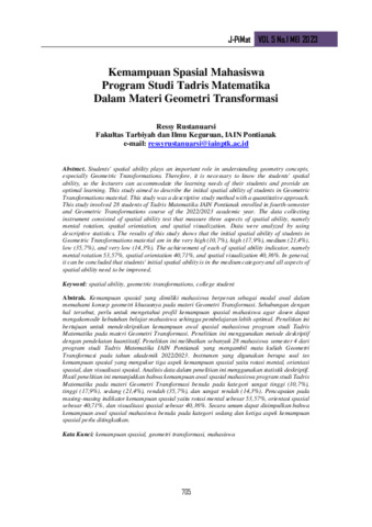 Ressy, Rustanuarsi (2023) Kemampuan spasial mahasiswa Program Studi Tadris Matematika dalam materi Geometri Transformasi. Jurnal Pendidikan Matematika (J-PiMat), 5 (1): 11. pp. 705-714. ISSN 2684-7981
