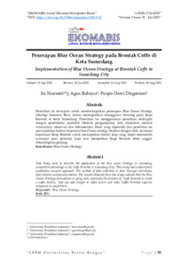 Penelitian ini bertujuan untuk mendeskripsikan penerapan Blue Ocean Strategy (Strategi Samudra Biru) dalam meningkatkan keunggulan bersaing pada Kopi Brontak di Kota Sumedang. Penelitian ini menggunakan penelitian deskriptif dengan pendekatan kualitatif. Metode pengumpulan data dilakukan melalui wawancara, observasi dan dokumentasi. Hasil yang diperoleh dari penelitian ini menunjukkan bahwa formulasi blue Ocean strategy berjalan dengan baik, terutama keputusan Kopi Brontak untuk menciptakan histori kopi yang dapat menambah wawasan para pencinta kopi dan menjadikan Kopi Brontak lebih unggul dibandingkan pesaing.