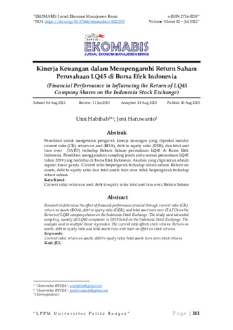 Umi, Habibah and Joni, Heruwanto (2022) Kinerja keuangan dalam mempengaruhi return saham perusahaan lq45 di Bursa Efek Indonesia. Jurnal Ekonomi Manajemen Bisnis (EKOMABIS), 3 (2): 8. pp. 181-190. ISSN 2716-0238