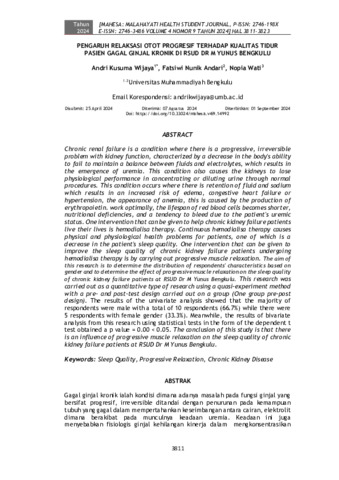 Andri, Kusuma Wijaya and Fatsiwi, Nunik Andari and Nopia, Wati (2024) Pengaruh relaksasi otot progresif terhadap kualitas tidur pasien gagal ginjal kronik di RSUD Dr M Yunus Bengkulu. MAHESA: Malahayati Health Student Journal, 4 (9): 15. pp. 3811-3823. ISSN 2746-198X