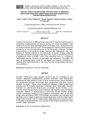 Ardi, R. Lukita and Dewi, Wijayanti and Ahmat, Pujianto and Hendy, Lesmana and Donny, Tri Wahyudi (2024) Analisis tingkat pengetahuan tentang Covid-19 terhadap kepatuhan mahasiswa menerapkan protokol kesehatan di laboratorium keperawatan. MAHESA: Malahayati Health Student Journal, 4 (9): 16. pp. 3824-3838. ISSN 2746-198X