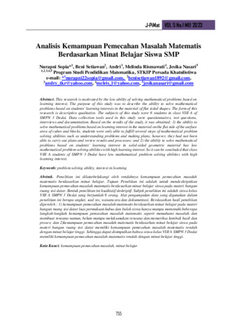 Nurapni, Sopia and Beni, Setiawan and Andri, Andri and Melinda, Rismawati and Jesika, Nasari (2023) Analisis kemampuan pemecahan masalah matematis berdasarkan minat belajar siswa SMP. Jurnal Pendidikan Matematika (J-PiMat), 5 (1): 16. pp. 755-764. ISSN 2684-7981