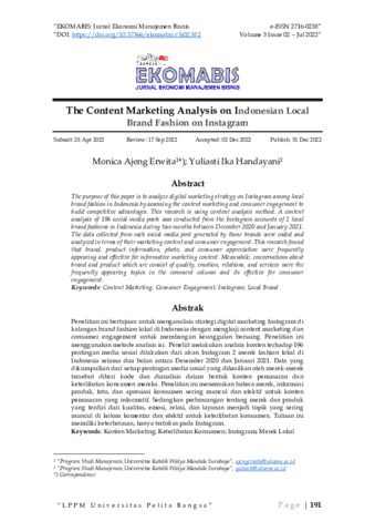Monica, Ajeng Erwita and Yuliasti, Ika Handayani (2022) The content marketing analysis on Indonesian local brand fashion on instagram. Jurnal Ekonomi Manajemen Bisnis (EKOMABIS), 3 (2): 9. pp. 191-204. ISSN 2716-0238
