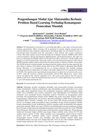 Penelitian ini menggunakan metode penelitian dan pengembangan dengan model penelitian adalah bentuk ADDIE meliputi tahap Analysis (analisis), Design (perancangan), Development (pengembangan), Implementation (implementasi), dan Evaluation (evaluasi). Penelitian ini dilakukan di salah satu SMP Negeri Ketapang dengan subjek penelitian terdiri dari ahli atau validator, guru, dan siswa kelas VIII berjumlah 20 orang. Tujuan penelitian ini adalah untuk mengembangkan media pembelajaran berupa modul ajar materi SPLDV berbasis model pembelajaran problem based learning terhadap kemampuan pemecahan masalah. Berdasarkan hasil pengembangan, penelitian, dan pembahasan terhadap modul ajar materi SPLDV berbasis model pembelajaran problem based learning terhadap kemampuan pemecahan masalah kelas VIII SMP Negeri Ketapang layak digunakan sebagai bahan ajar. Pengembangan modul ajar mencapai Tingkat kevalidan dengan kategori sangat valid dengan kevalidan media 85,13% dan materi 87,69%, Tingkat kepraktisan dengan kriteria sangat praktis ditunjukkan dengan angket respon siswa yang mencapai nilai 82 % dan angket respon guru 86%, serta Tingkat keefektifan dengan kriteria efektif berdasarkan nilai ketuntasan yang ditentukan sekolah. Hasil tes menunjukkan rata-rata siswa mendapatkan nilai 79,87.